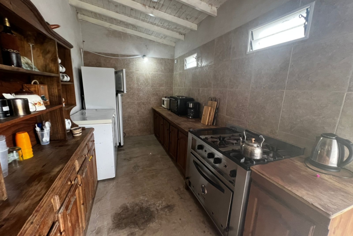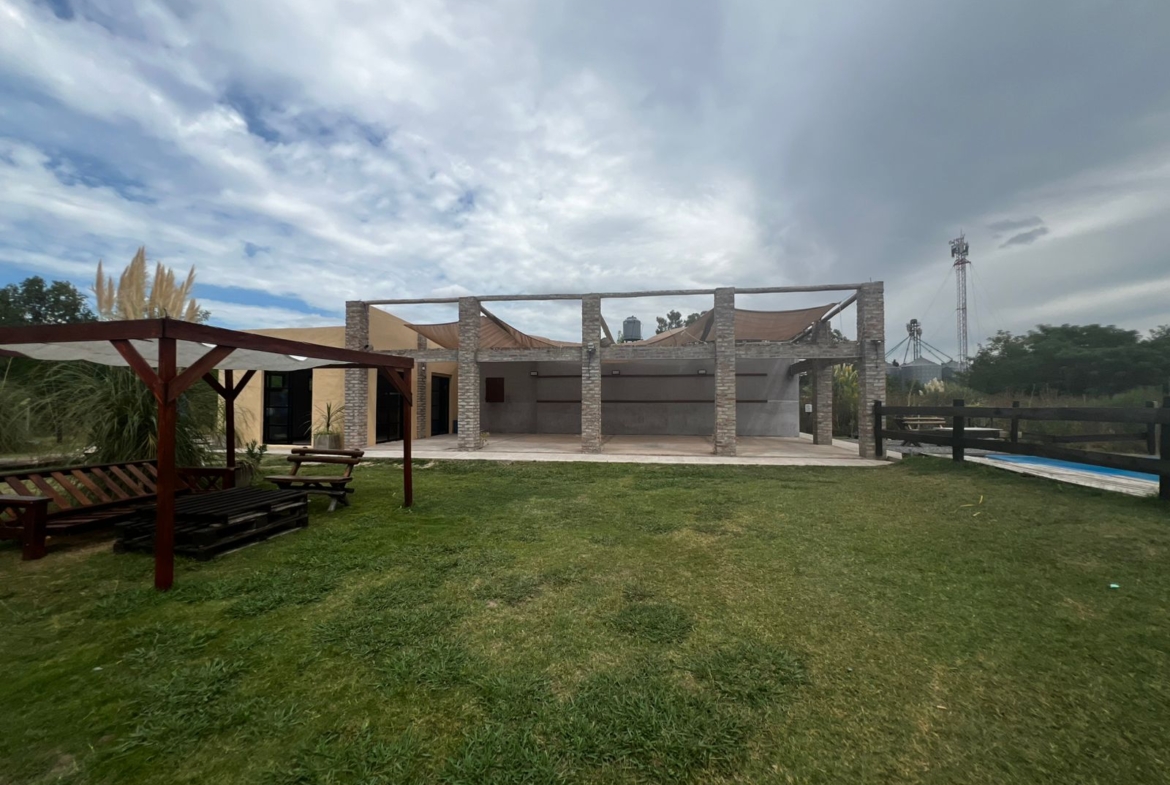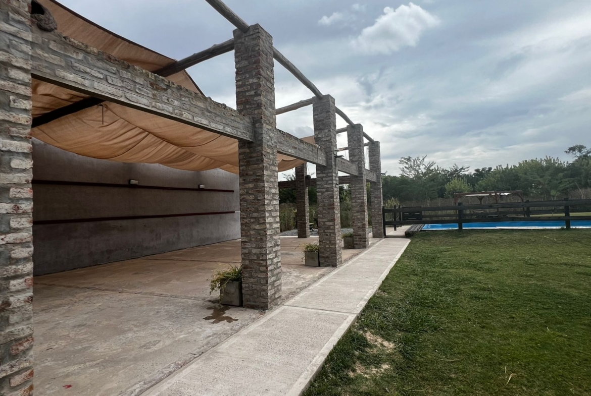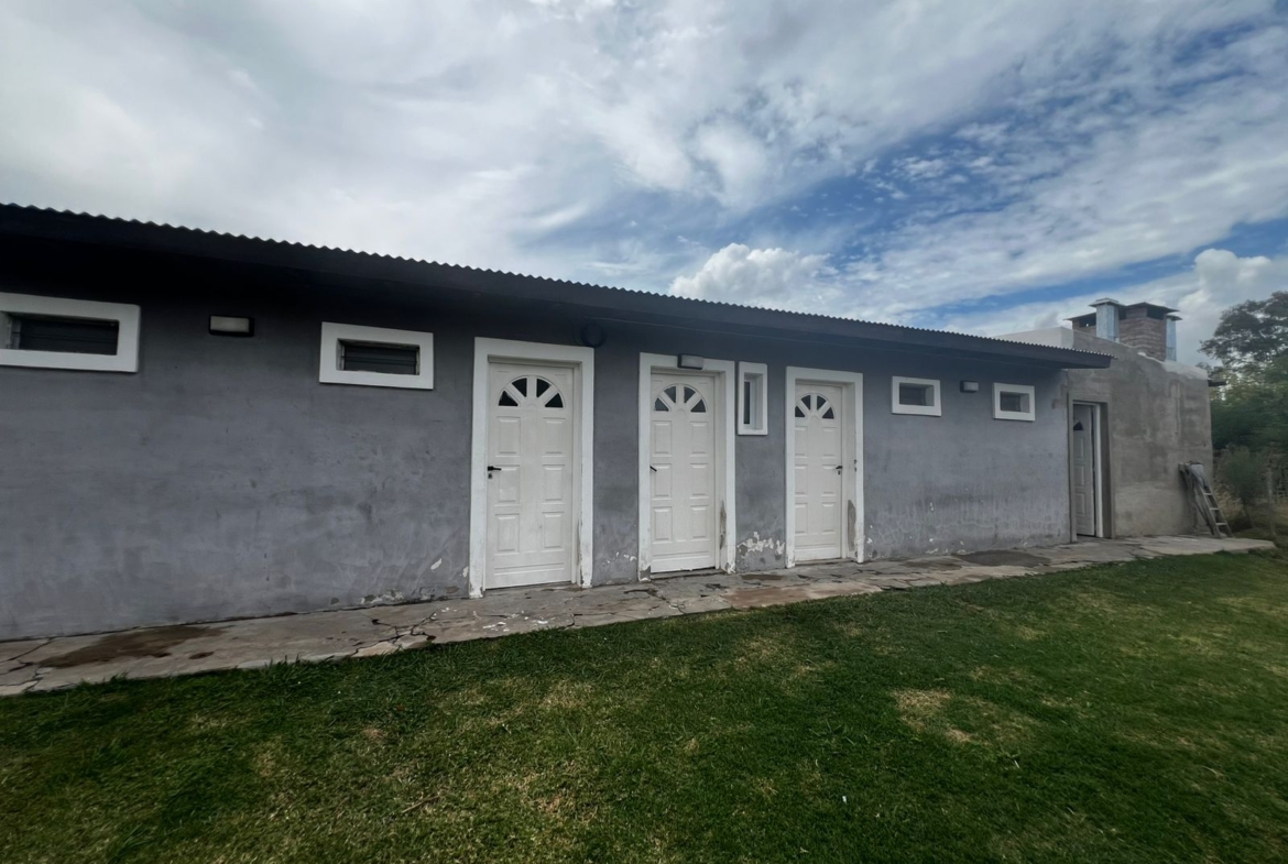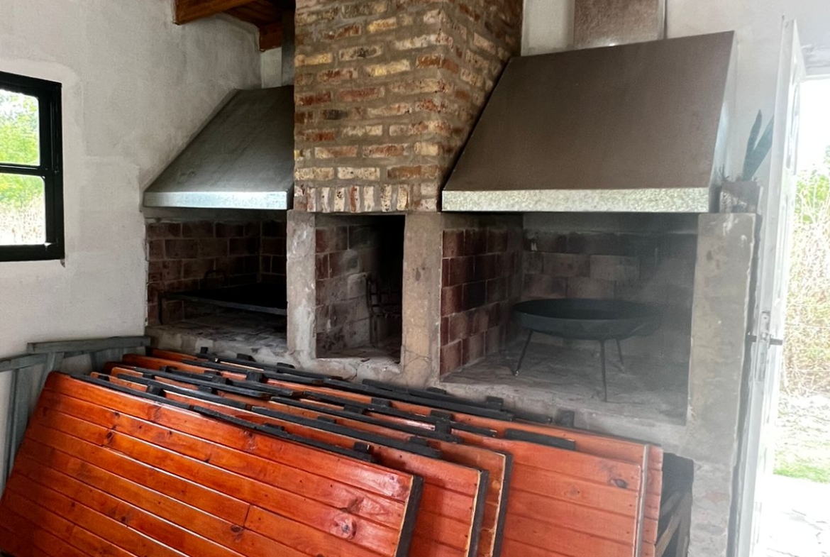 El Predio consiste en un gran parque con una construcción cerrada de baño y cocina – diseñado para dos baños y vestuario- y una parte, base de hormigón semicubierta, con barra, sin techar, de 12 x 6 mts.