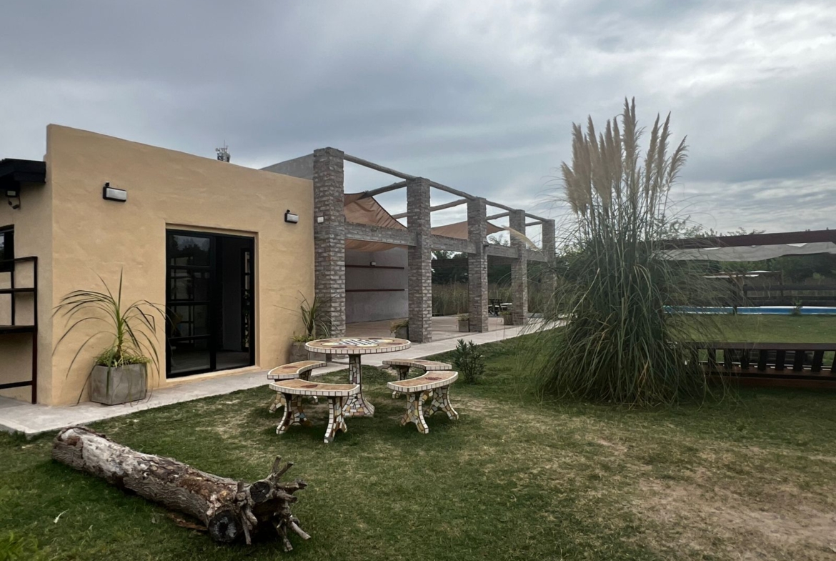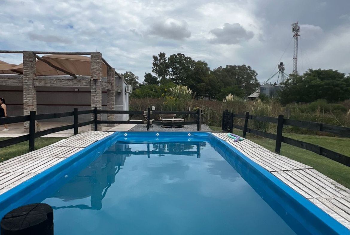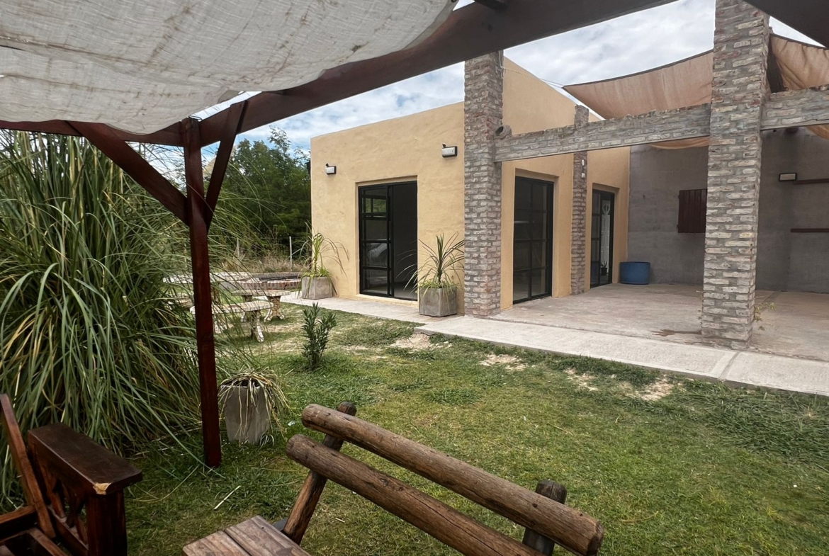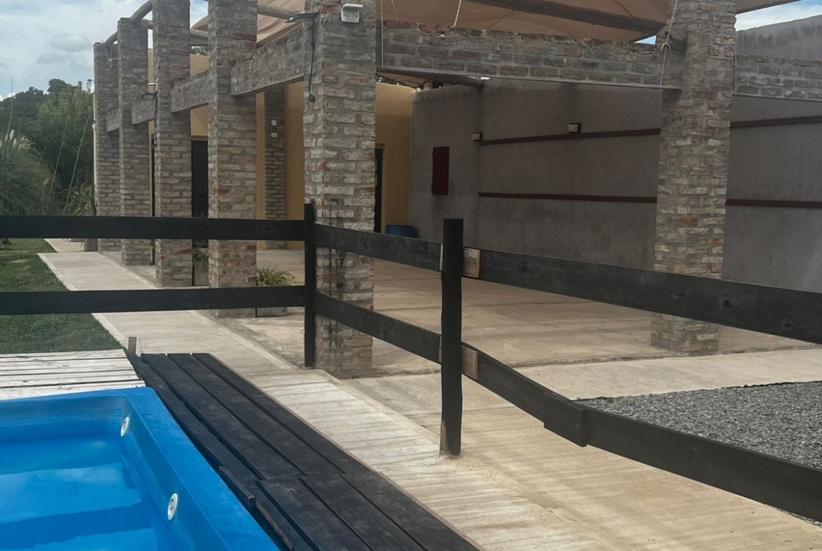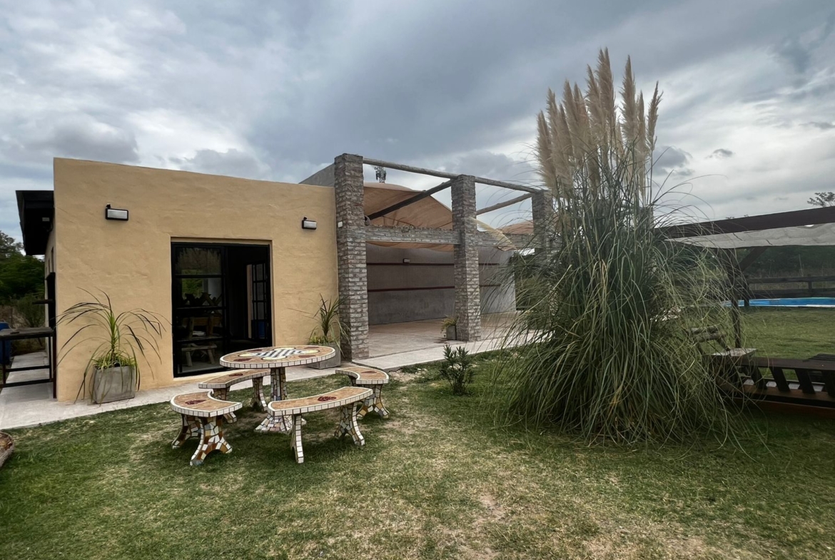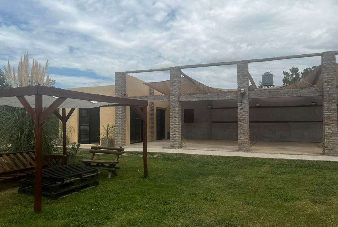 El Predio consiste en un gran parque con una construcción cerrada de baño y cocina – diseñado para dos baños y vestuario- y una parte, base de hormigón semicubierta, con barra, sin techar, de 12 x 6 mts.