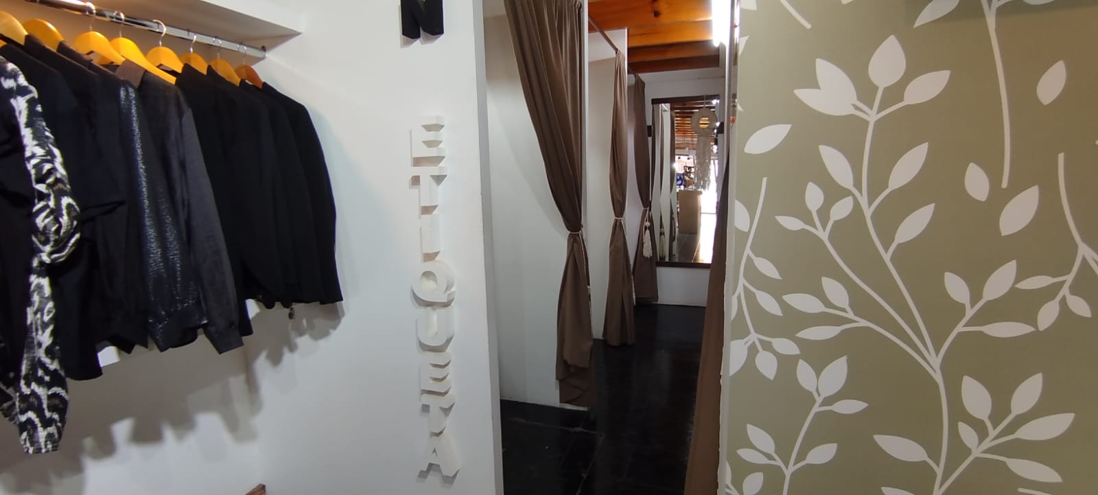 - 3 pufs tapizados, 3 alfombras de mimbre, cortinas en los 3 probadores, 4 espejos grandes de pared.